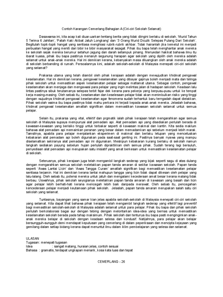 Pelajar boleh menggunakan contoh karangan yang disertakan di bawah untuk mengulang kaji. CONTOH KARANGAN CEMERLANG BAHAGIAN A Pada mayapada yang mendepani ombak globalisasi ini Unit Bimbingan dan Kaunseling di sekolah telah memikul obligasi yang vital untuk memastikan perkembangan mental dan rohani pelajar-. Dicatat oleh Cikgu Farah di.